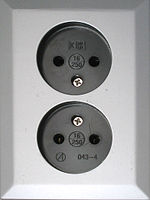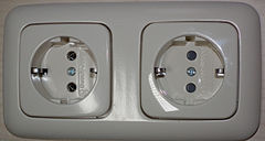 "Schuko" (/ˈʃuːkoʊ/) is a registered trademark[1] referring to a system of AC power plugs and sockets that is defined as "CEE 7/3" (sockets) and "CEE 7/4" (plugs). A Schuko plug features two round pins of 4.8 mm diameter (19 mm long, centers 19 mm apart) for the line and neutral contacts, plus two flat contact areas on the top and bottom side of the plug for protective earth (ground). The socket (which is often, in error, also referred to as CEE 7/4) has a predominantly circular recess which is 17.5 mm deep with two symmetrical round apertures and two earthing clips on the sides of the socket positioned to ensure that the earth is always engaged before live pin contact is made. Schuko plugs and sockets are symmetric AC connectors. They can be mated in two ways, therefore line can be connected to either pin of the appliance plug. As with most types of European sockets, Schuko sockets can accept Europlugs. Schuko plugs are considered a very safe design when used with Schuko sockets, but they can also mate with other sockets to give an unsafe result.
