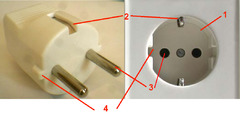 When inserted into the socket, the Schuko plug covers the socket cavity (1) and establishes protective-earth connection through the earth clips (2) before the line and neutral pins (3) establish contact, thereby preventing users from touching connected pins. A pair of non-conductive guiding notches (4) on the left and right side provides extra stability, enabling the safe use of large and heavy plugs (e.g. with built-in transformers or timers).