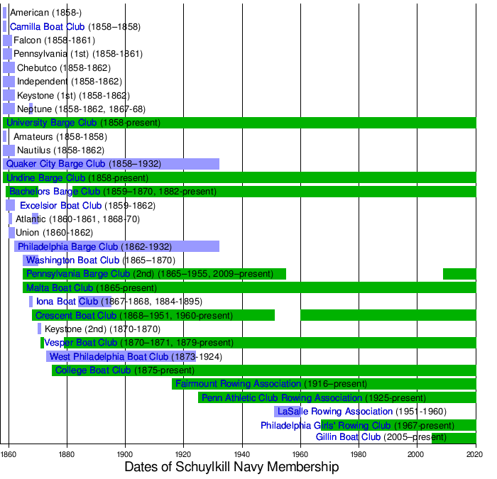 In March 1860, Union Boat Club and Atlantic Barge Club (the 1st) joined the Schuylkill Navy.[8] In September 1860 the founding club, Camilla Boat Club, resigned.[8] By June 1861, Falcon, Pennsylvania, and Atlantic had dissolved.[8] Half of the remaining Schuylkill Navy clubs lapsed during the Civil War.[11] As of August 1865 Chebutco, Excelsior, Union, Independent, and Keystone no longer existed.[10]