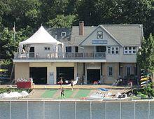 Located at No. 11 Boathouse Row, College Boat Club houses the University of Pennsylvania rowing teams. College Boat Club houses the Men's, Women's and Lightweight squads, and its constituency is entirely made up of past rowers.[60] The boathouse was established in 1872 after the University of Pennsylvania moved its campus from Center City to West City, and became a member of the Schuylkill Navy in 1875.[61] College Boat Club was admitted to the Schuylkill Navy in 1875.[62] It was initially founded to give University of Pennsylvania students an alternative to the school's original Boathouse, University Barge Club.[53][61] In 1877 University of Pennsylvania rowers from the club beat the University of Pennsylvania rowers from University Barge Club,[61] making College Boat Club the official hub for most University of Pennsylvania rowers by 1879.[61] By 1893 membership was opened to alumni and enrolled students.[61]