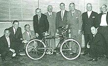 Schwinn developed the Corvette in 1954, after their catalog, for that year, had been in use. Therefore, with the release of a single photograph, the Corvette was introduced. The picture showed company executives standing behind their new product, that would remain in production for 10 years. 1955 was the first year in which the Corvette appeared in the Schwinn catalog; it was Schwinn's top listing in their "middleweight" category.[22]