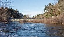 The main Scituate reservoir was formed by the construction of a dam across the Pawtuxet River at the former village of Kent. The dam, principally of earth, is about 3,200 feet (980 m) long and 100 feet (30 m) high. Water storage in the reservoir began on November 10, 1925. An aqueduct from the dam feeds the nearby treatment plant which was placed in operation on September 30, 1926.
