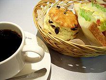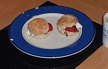 A scone (/skoʊn/, also UK: /skɒn/) is a baked good, usually made of wheat, or oatmeal with baking powder as a leavening agent and baked on sheet pans. A scone is often slightly sweetened and occasionally glazed with egg wash.[1] The scone is a basic component of the cream tea. It differs from teacakes and other types of sweets that are made with yeast. Scones were chosen as the Republic of Ireland representative for Café Europe during the Austrian Presidency of the European Union in 2006, while the United Kingdom chose shortbread.