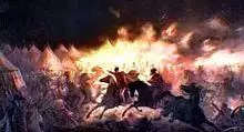 In 1812, Emperor Alexander I was able to render Napoleon's invasion of Russia useless by using a scorched-earth retreat policy, similar to that of Portugal.[27] As Russians withdrew from the advancing French army, they burned the countryside (and allegedly Moscow[28]) over which they passed, leaving nothing of value for the pursuing French army. Encountering only desolate and useless land Napoleon's Grande Armée was prevented from using its usual doctrine of living off the lands that it conquered. Pushing relentlessly on despite dwindling numbers, the Grand Army met with disaster as the invasion progressed. Napoleon's army arrived in a virtually-abandoned Moscow, which was a tattered starving shell of its former self, largely because of scorched-earth tactics by the retreating Russians. Having conquered essentially nothing, Napoleon's troops retreated, but the scorched-earth policy came into effect again because even though some large supply dumps had been established on the advance, the route between them had both been scorched and marched over once already. Thus, the French army starved as it marched along the resource-depleted invasion route.[29]
