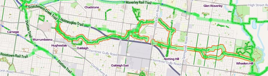 It runs from East Malvern railway station through to Jells Park although several sections consist of normal residential streets. The trail provides good access to Chadstone Shopping Centre and Holmesglen Institute of TAFE for the local community. The trail passes through Valley Reserve in Mount Waverley, which is one of the last remaining stands of indigenous vegetation in the local area.