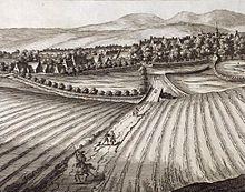 Before the seventeenth century, with difficult terrain, poor roads and methods of transport there was little trade between different areas of the country and most settlements depended on what was produced locally, often with very little in reserve in bad years. Most farming was based on the lowland fermtoun or highland baile, settlements of a handful of families that jointly farmed an area notionally suitable for two or three plough teams, allocated in run rigs, of "runs" (furrows) and "rigs" (ridges), to tenant farmers. Most ploughing was done with a heavy wooden plough with an iron coulter, pulled by oxen, which were more effective in the heavy Scottish soil, and cheaper to feed than horses.[4] Those with property rights included husbandmen, lesser landholders and free tenants.[5] Below them were the cottars, who often shared rights to common pasture, occupied small portions of land and participated in joint farming as hired labour. Farms also might have grassmen, who had rights only to grazing.[5] Three acts of parliament passed in 1695 allowed the consolidation of runrigs and the division of common land.[6]
