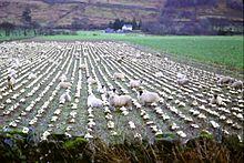 The English plough was introduced along with foreign grasses, the sowing of rye grass and clover. Turnips and cabbages were introduced, lands enclosed and marshes drained, lime was put down, roads built and woods planted. Drilling and sowing and crop rotation were introduced. The introduction of the potato to Scotland in 1739 greatly improved the diet of the peasantry. Enclosures began to displace the runrig system and free pasture. There was increasing specialisation, with the Lothians became a major centre of grain, Ayrshire of cattle breeding and The Borders of sheep.[7]