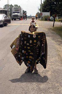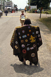The camp blanket[2] is a significant piece of memorabilia for many Scouts and Girl Guides around the world. Scouts and Guides sew badges onto the blanket to represent all their achievements and events competed in, and out, of Scouting. Camp blankets are often used to display and store badges "earned" in a younger section, e.g. a Guide will sew her Brownie badges onto her blanket or a Scout will sew his Cub badges.[3]