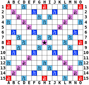 The board is marked with "premium" squares, which multiply the number of points awarded: eight dark red "triple-word" squares, 17 pale red "double-word" squares, of which one, the center square (H8), is marked with a star or other symbol, 12 dark blue "triple-letter" squares, and 24 pale blue "double-letter" squares. In 2008, Hasbro changed the colors of the premium squares to orange for TW, red for DW, blue for DL, and green for TL, but the original premium square color scheme is still preferred for Scrabble boards used in tournaments.[6]