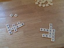 Take Two (also called Speed Scrabble[8] and similar to Bananagrams) is a fast-paced, non-turn-based Scrabble variant played without a board. Tiles are placed face-down in the middle of the table in a communal pool and each player is given a small number of face-up starting tiles. From their starting tiles, each player tries to build his own valid Scrabble grid—players do not use each other's grid or tiles. When a player successfully uses all of his face-up tiles, he shouts "take two", and every player takes two more tiles. Play continues until there are no more tiles left to draw. In some variants, the person who creates the first complete grid when all the tiles run out is the winner. In others, a calculation based on word length is used to determine the winner.
