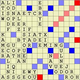 This game is a cross between Othello and Scrabble played on a 13 x13 board. Each player has different coloured tiles. The rack is common and always contains 7 tiles. All tiles have the same value, one point. Points are scored for how many tiles are currently your own colour. The special squares are pink and orange. A word with a tile on a pink square clears the board. When this happens a bonus point is received for each tile you placed on an orange square on that board.[18]