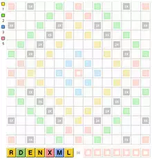 This game has the same rules and tiles as Scrabble, but the board is larger (21x21 vs. 15x15 in the original). With the larger board there are more premium squares, going up to quadruple letter and quadruple word scores. There are also twice as many tiles with a slightly different distribution.*[13]