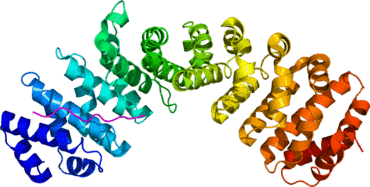 Structure of mouse importin (rainbow colored cartoon, N-terminus = blue, C-terminus = red) bound the nuclear localisation sequence of PLSCR1 scramblase (magenta tube; left hand side of figure).[7]