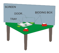 The screen is placed diagonally across the table in such fashion that North and East, South and West are screenmates. The board is placed in the middle of a movable tray. The screen is closed so that the bidding tray can just pass under it. It is North's responsibility to place the board on, and to remove the board from the bidding tray. It is West's responsibility to adjust the screen aperture; it is closed (and remains so during the whole of the auction period) so that the bidding tray can just pass under it. The players remove the cards from the board.