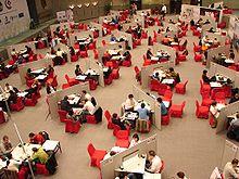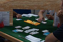Screens are normally used on high-level competitions, such as World Bridge Olympiads, national teams championships and similar. They are always accompanied with bidding boxes and a tray for moving the bids across. Screens were first introduced in Bermuda Bowl competition in 1975, at the home venue in Bermuda; however, they didn't prevent the foot-tapping scandal involving two Italian players.[1] Following that event, screens used in high-level events extend under the table to the floor forming a barrier running diagonally between two table legs.