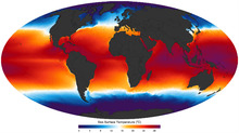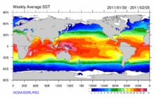 SST was one of the first oceanographic variables to be measured. Benjamin Franklin suspended a mercury thermometer from a ship while travelling between the United States and Europe in his survey of the Gulf Stream in the late eighteenth century. SST was later measured by dipping a thermometer into a bucket of water that was manually drawn from the sea surface. The first automated technique for determining SST was accomplished by measuring the temperature of water in the intake port of large ships, which was underway by 1963. These observations have a warm bias of around 0.6 °C (1 °F) due to the heat of the engine room.[7] This bias has led to changes in the perception of global warming since 2000.[8] Fixed weather buoys measure the water temperature at a depth of 3 metres (9.8 ft). Measurements of SST have had inconsistencies over the last 130 years due to the way they were taken. In the nineteenth century, measurements were taken in a bucket off of a ship. However, there was a slight variation in temperature because of the differences in buckets. Samples were collected in either a wood or an uninsulated canvas bucket, but the canvas bucket cooled quicker than the wood bucket. The sudden change in temperature between 1940 and 1941 was the result of an undocumented change in procedure. The samples were taken near the engine intake because it was too dangerous to use lights to take measurements over the side of the ship at night.[9] Many different drifting buoys exist around the world that vary in design, and the location of reliable temperature sensors varies. These measurements are beamed to satellites for automated and immediate data distribution.[10] A large network of coastal buoys in U.S. waters is maintained by the National Data Buoy Center (NDBC).[11] Between 1985 and 1994, an extensive array of moored and drifting buoys was deployed across the equatorial Pacific Ocean designed to help monitor and predict the El Niño phenomenon.[12]