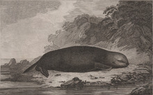 The first scientific description of the sea otter is contained in the field notes of Georg Steller from 1751, and the species was described by Linnaeus in his Systema Naturae of 1758.[5] Originally named Lutra marina, it underwent numerous name changes before being accepted as Enhydra lutris in 1922.[6] The generic name Enhydra, derives from the Ancient Greek en/εν "in" and hydra/ύδρα "water",[7] meaning "in the water", and the Latin word lutris, meaning "otter".[8]