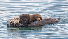 Females perform all tasks of feeding and raising offspring, and have occasionally been observed caring for orphaned pups.[79] Much has been written about the level of devotion of sea otter mothers for their pups – a mother gives her infant almost constant attention, cradling it on her chest away from the cold water and attentively grooming its fur.[80] When foraging, she leaves her pup floating on the water, sometimes wrapped in kelp to keep it from floating away;[81] if the pup is not sleeping, it cries loudly until she returns.[82] Mothers have been known to carry their pups for days after the pups' deaths.[74]