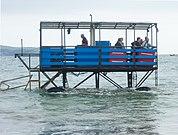 The United States Army Corps of Engineers operates a three-wheeled sea tractor called the Coastal Research Amphibious Buggy (CRAB). This 8.2-tonne (18,000 lb) vehicle consists of a wheeled tripod supporting an operating platform 10.7 metres (35 ft) above ground level. It can move at 2 kilometres per hour (1.2 mph) on land and at a somewhat slower speed in water. It was built for scientific research on Beach nourishment.[2]