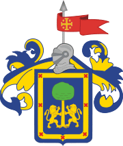 The Coat of arms or Seal of Guadalajara consists of a blue field, a pine of sinople outlined, two lions rampantes of color, opposite to forehead and the legs on the trunk, embroidery is of gold, consists of seven arms of gules. For stamp, closed helmet and for cimera a flag of gules, loaded with a cross of Jerusalem to the one that uses as shaft a lance of the same color, the lambrequins are of gold and blue alternated.