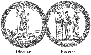 The great seal of the Commonwealth of Virginia shall consist of two metallic discs, two and one-fourth inches in diameter, with an ornamental border one fourth of an inch wide, with such words and figures engraved thereon as will, when used, produce impressions to be described as follows: On the obverse, Virtus, the genius of the Commonwealth, dressed as an Amazon, resting on a spear in her right hand, point downward, touching the earth; and holding in her left hand, a sheathed sword, or parazonium, pointing upward; her head erect and face upturned; her left foot on the form of Tyranny represented by the prostrate body of a man, with his head to her left, his fallen crown nearby, a broken chain in his left hand, and a scourge in his right. Above the group and within the border conforming therewith, shall be the word "Virginia," and, in the space below, on a curved line, shall be the motto, "Sic Semper Tyrannis." On the reverse, shall be placed a group consisting of Libertas, holding a wand and pileus in her right hand; on her right, Aeternitas, with a globe and phoenix in her right hand; on the left of Libertas, Ceres, with a cornucopia in her left hand, and an ear of wheat in her right; over this device, in a curved line, the word "Perseverando."[11]