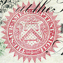 For several decades, the color and style of the printed seal varied greatly from issue to issue (and even within the same issue). The basic seal was the same, but the circumferences were embellished with lathework decoration such as scallops, beading, or spikes. Among the colors used for the seal during this period were red, blue, and brown.[7]