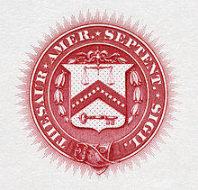 In addition to the elements still found on the current seal, the original featured more ornamentation and the Latin inscription THESAUR. AMER. SEPTENT. SIGIL. around the rim. The inscription is an abbreviation for the phrase Thesauri Americae Septentrionalis Sigillum, which translates to "The Seal of the Treasury of North America".[6] The reason for the original wording that embraced all of North America is unknown,[1] although the first national bank—chartered in 1781 to help solidify the nation's finances—was named the Bank of North America.