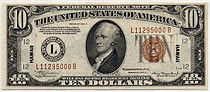 The usage of the seal was standardized starting on the smaller-sized notes of Series 1928. The seal was printed with a toothed outer edge, and other than the color were the same across all styles of currency. Federal Reserve Notes were issued with a green seal, silver certificates with a blue seal, gold certificates with an orange seal, United States Notes with a red seal, and National Bank Notes and Federal Reserve Bank Notes with brown seals.[7]