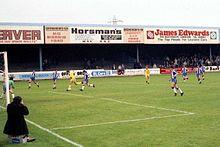 Chester moved to Sealand Road from Whipcord Lane in 1906, thanks to the help of local MP Alfred Mond.[1] The first game was on 15 December 1906, when Chester beat Bangor City 4–0 in The Combination. Over the years The Stadium continued to take shape, with improved cover stands helping Chester win election to the Football League in 1931. The stadium was one of the first to have a public address system, with the matchday announcer regularly saying "Hello Spion Kop, Hello Albert". From 1990 to 2000, Chester had a fanzine called Hello Albert. Albert was believed to be a long-standing supporter.[2]