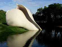 A very large outdoor sculpture at Akkulam of a gastropod seashell is a reference to the sacred chank shell Turbinella pyrum of India. In 2003, Maggi Hambling designed a striking 13 ft (4 m) high sculpture of a scallop shell which stands on the beach at Aldeburgh, in England. The goddess of love, Venus or Aphrodite, is often traditionally depicted rising from the sea on a seashell. In The Birth of Venus, Botticelli depicted the goddess Venus rising from the ocean on a scallop shell.