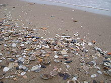 Empty seashells are often picked up by beachcombers. However, the majority of seashells which are offered for sale commercially have been collected alive (often in bulk) and then killed and cleaned, specifically for the commercial trade.[1] This type of large-scale exploitation can sometimes have a strong negative impact on local ecosystems, and sometimes can significantly reduce the distribution of rare species.