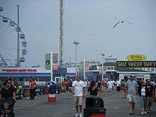 Casino Pier and Funtown Pier (partially located within both Seaside Heights and neighboring Seaside Park) are amusement parks, each situated on a pier extending approximately 300 feet (100 m) into the Atlantic Ocean. Each of the two piers are part of a boardwalk that stretches for 2 miles (3.2 km) and offers many family-friendly attractions ranging from arcades, to games of chance, to beaches, and to the wide variety of foods and desserts, all within walking distance.[48] Breakwater Beach (formerly known as Water Works) is a water park situated across the street from Casino Pier.