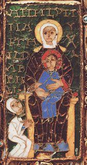 An enamel plaque on the processional Cross of Mathilde, showing an image of the donor together with Mary, Seat of Wisdom