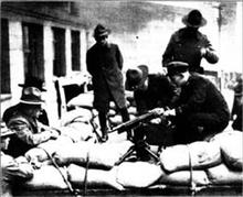 Mayor Hanson had federal troops available and stationed 950 sailors and marines across the city by February 7. He added 600 men to the police force and hired 2,400 special deputies, students from the University of Washington for the most part.[13]:87 On February 7, Mayor Hanson threatened to use 1,500 police and 1,500 troops to replace striking workers the next day, but the strikers assumed this was an empty threat and were proved correct.[19] The Mayor continued his rhetorical attack on February 9, saying that the "sympathetic strike was called in the exact manner as was the revolution in Petrograd."[20] Mayor Hanson told reporters that "any man who attempts to take over the control of the municipal government functions will be shot."[21]