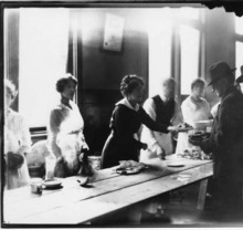 In other cases, workers acted on their own initiative to create new institutions. Milk wagon drivers, after being denied the right by their employers to keep certain dairies open, established a distribution system of 35 neighborhood milk stations. A system of food distribution was also established, which throughout the strike committee distributed as many as 30,000 meals each day. Strikers paid twenty-five cents per meal, and the general public paid thirty-five cents. Beef stew, spaghetti, bread, and coffee were offered on an all-you-can-eat basis.[12]