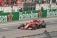 After showing impressive pace throughout pre-season testing in Barcelona, Vettel and his new teammate Charles Leclerc headed to Australia with many pundits believing they had the car to beat for the 2019 season.[172] The opening weekend proved to be difficult, however, as Vettel qualified some seven tenths off pole position in third and finished the race in fourth place.[173] Third-place finishes in China and Azerbaijan followed, as Mercedes continued to dominate.[174] Vettel took pole position in Canada; his first pole in 17 races.[175] Midway though the race, a snap of oversteer caused him to run wide onto the grass. Vettel received a five-second time penalty from the stewards, who believed he had returned to the track "in an unsafe manner and forced [Hamilton] off track".[176] Vettel crossed the line in first place but lost his victory as a result of the penalty. After the race, he swapped the number one and two signs in front of Hamilton's Mercedes and his own car.[177] At the German Grand Prix, Vettel was unable to qualify after a turbo issue, which meant he would start in last place. During a race with mixed weather conditions, Vettel climbed up to second place.[178] In Italy, Vettel spun at the Ascari chicane and when he re-entered the track, he made contact with Racing Point's Stroll. Vettel received a 10-second stop-go penalty and finished in 13th place.[179] At the Singapore Grand Prix, Vettel won on a circuit Ferrari were expected to struggle at. For the first time, Vettel had won five times at the same track.[180] The following race, in Russia, Vettel went from third place on the grid to first place in the first corner. However, radio transmissions suggested that the team wanted to swap their drivers, but with Vettel the quicker driver, he remained in front. Vettel retired soon after with a MGU-K problem.[181]