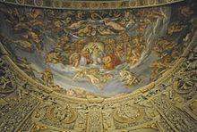 His 1565 painting, Birth of the Virgin, recalls the canvas of Andrea del Sarto.[5] He painted large altarpieces for the Certosa of Ferrara, Vision of Saint Paul for Massa Lombarda, and Madonna and Child with Saints and Patrons in Rovigo in 1565. He painted a fresco of Last Judgment, highly imitative of Michelangelo, for both the carthusian church St. Christophorus (1578) and for the apse roof of Ferrara Cathedral (1577–1581).[6]