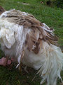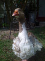 The Sebastopol is a breed of domestic goose, descended from the European Greylag goose.[1] First exhibited in England in 1860 under the name 'Sebastopol goose';[2] they were also referred to as Danubian geese; a name first used for the breed in Ireland in 1863.[3] 'Danubian' was used as a synonym in the 19th century; and only given precedence by Edward Brown after the turn of the 19th century.[4] The Sebastopol is a medium-sized goose with long, white curly feathers. The feathers of the neck are smooth and sometimes greyish brown. Crosses have produced all-grey, buff, and saddle back variants.[5][6] Feathers on the breast may be curly (frizzle) or smooth. The gander weighs 12-14 lbs while the goose weighs 10-12 lbs. The legs and shanks are orange and the eyes bright blue. Grey and buff colored Sebastopol have brown eyes. On average, females produce 25-35 eggs per year.[7] Though domesticated breeds of geese generally retain some flight ability, Sebastopols cannot fly well due to the curliness of their feathers and have difficulty getting off the ground.[8][9] They need plenty of water to keep themselves clean, and to clean their sinuses (as do all waterfowl).[10]