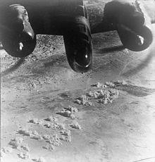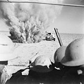 Prior to the main barrage, there was a diversion by the 24th Australian Brigade, which involved the 15th Panzer Division being subjected to heavy fire for a few minutes.[36] Then at 21:40 (Egyptian Summer Time) on 23 October[37] on a calm, clear evening under the bright sky of a full moon, Operation Lightfoot began with a 1,000-gun barrage. The fire plan had been arranged so that the first rounds from the 882 guns from the field and medium batteries would land along the 40 mi (64 km) front at the same time.[38] After twenty minutes of general bombardment, the guns switched to precision targets in support of the advancing infantry.[39] The shelling plan continued for five and a half hours, by the end of which each gun had fired about 600 rounds, about 529,000 shells.