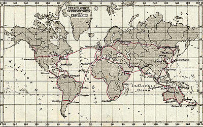 The rapid expansion of telegraph networks took place throughout the century, with the first undersea cable being built by John Watkins Brett between France and England. The Atlantic Telegraph Company was formed in London in 1856 to undertake to construct a commercial telegraph cable across the Atlantic Ocean. This was successfully completed on 18 July 1866 by the ship SS Great Eastern, captained by Sir James Anderson after many mishaps along the away.[79] From the 1850s until 1911, British submarine cable systems dominated the world system. This was set out as a formal strategic goal, which became known as the All Red Line.[80]