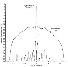 The ground antenna is highly directional but cannot be designed without sidelobes. Aircraft could also detect interrogations coming from these sidelobes and reply appropriately. However these replies can not be differentiated from the intended replies from the main beam and can give rise to a false aircraft indication at an erroneous bearing. To overcome this problem the ground antenna is provided with a second, mainly omni-directional, beam with a gain which exceeds that of the sidelobes but not that of the main beam. A third pulse, P2, is transmitted from this second beam 2 µs after P1. An aircraft detecting P2 stronger than P1 (therefore in the sidelobe and at the incorrect main lobe bearing), does not reply.[7]