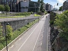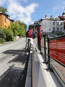 The first Danish route, C99, opened in 2012 between the Vesterbro rail station in Copenhagen and Albertslund, a western suburb. The route cost 13.4 million DKK and is 17.5 km long, built with few stops and new paths away from traffic. "Service stations" with air pumps are located at regular intervals, and where the route must cross streets, handholds and running boards are provided so cyclists can wait without having to put their feet on the ground.[30] Similar projects have since been built in Germany among other countries.