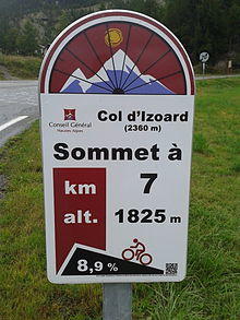In many places worldwide special signposts for bicycles are used to indicate directions and distances to destinations for cyclists. Apart from signposting in and between urban areas,[64] mountain pass cycling milestones have become an important service for bicycle tourists. They provide cyclists with information about their current position with regard to the summit of the mountain pass.[65]