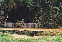 The Seine rises in the commune of Source-Seine, about 30 kilometres (19 mi) northwest of Dijon. The source has been owned by the city of Paris since 1864. A number of closely associated small ditches or depressions provide the source waters, with an artificial grotto laid out to highlight and contain a deemed main source. The grotto includes a statue of a nymph, a dog, and a dragon. On the same site are the buried remains of a Gallo-Roman temple. Small statues of the dea Sequana "Seine goddess" and other ex-votos found at the same place are now exhibited in the Dijon archaeological museum.