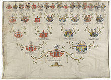 Seize quartiers is a French phrase which literally means a person's "sixteen quarters", the coats of arms of their sixteen great-great-grandparents quarters of nobility, which are typically accompanied by a five generation genealogy ahnentafel outlining the relationship between them and their descendant. They were used as a proof of nobility ("the proof of the Seize Quartiers") in Continental Europe beginning in the seventeenth century and achieving their highest prominence in the eighteenth. Possession of seize-quartiers guaranteed admission to any court in Europe, and bestowed many advantages. For example, Frederick the Great was known to make a study of the seize quartiers of his courtiers. They were less common in the British Isles, seventeenth-century Scottish examples being the most prevalent.