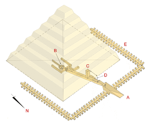 The entrance to Sekhemkhet's burial lies on the northern side of the pyramid. An open passage leads down for 200 ft. Halfway down the track a vertical shaft meets the passage from above. It opens on the surface and its entrance would lie at the second step of the pyramid, if the monument had been completed.