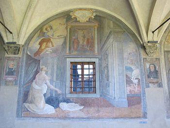 Fresco in the Basilica of Santa Maria Novella showing Saint Dominic with a discipline in his hand, kneeling before a crucifix