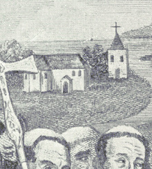 On the top left of the painting that hangs in the south transept of Chichester Cathedral, created by the early Tudor painter Lambert Barnard, is a representation of the old church and bell tower at Church Norton as it appeared in the 16th century.[2] The 1911 excavation of the mound revealed some strong stone foundations for a square tower and the remains of a ringwork. It is probable that the foundations were for the bell tower, shown separate from the church on the Barnard painting. The tower would have been constructed in the 11th century or earlier as a fortification and not actually part of the church. A churchwarden's presentment[f] from 1662 stated "That there was never any steeple belonging to the church (at Selsey), but a tower formerly belonging to a ruined castle, somewhat remote from the church where the bells hung...". It seems that the old tower lasted till 1602 when it blew down. A replacement tower was constructed, this time attached to the church, in 1662. The ringwork was possibly established soon after 1066 and as the bishopric was not moved to Chichester till after 1075, it is likely that it was constructed to protect Wilfrid's 7th-century church.[33]