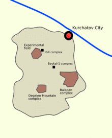 ![]() The 18,000 km2 expanse of the Semipalatinsk Test Site (indicated in red), attached to Kurchatov (along the Irtysh river), and near Semey, as well as Karagandy, and Nur-Sultan. The site comprised an area the size of Wales | |