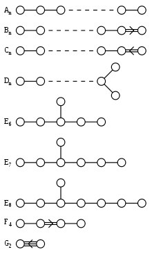 Every semisimple Lie algebra over an algebraically closed field of characteristic 0 is a direct sum of simple Lie algebras (by definition), and the finite-dimensional simple Lie algebras fall in four families – An, Bn, Cn, and Dn – with five exceptions E6, E7, E8, F4, and G2. Simple Lie algebras are classified by the connected Dynkin diagrams, shown on the right, while semisimple Lie algebras correspond to not necessarily connected Dynkin diagrams, where each component of the diagram corresponds to a summand of the decomposition of the semisimple Lie algebra into simple Lie algebras.